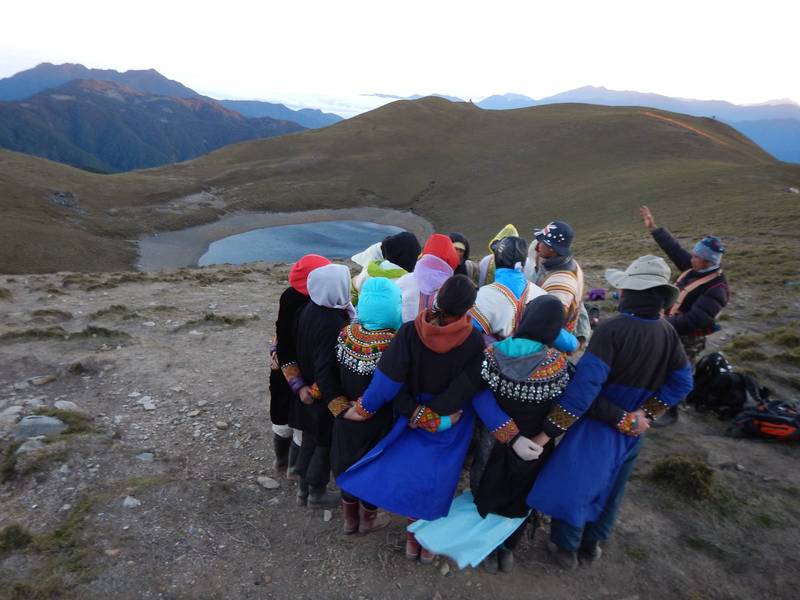 卡法司牧師告誡同學不能走下該湖泊後,請同學們圍成一圈,以Pasibutbut (巴布合音)同心合一敬拜創造神DIHANIN。(作者提供)